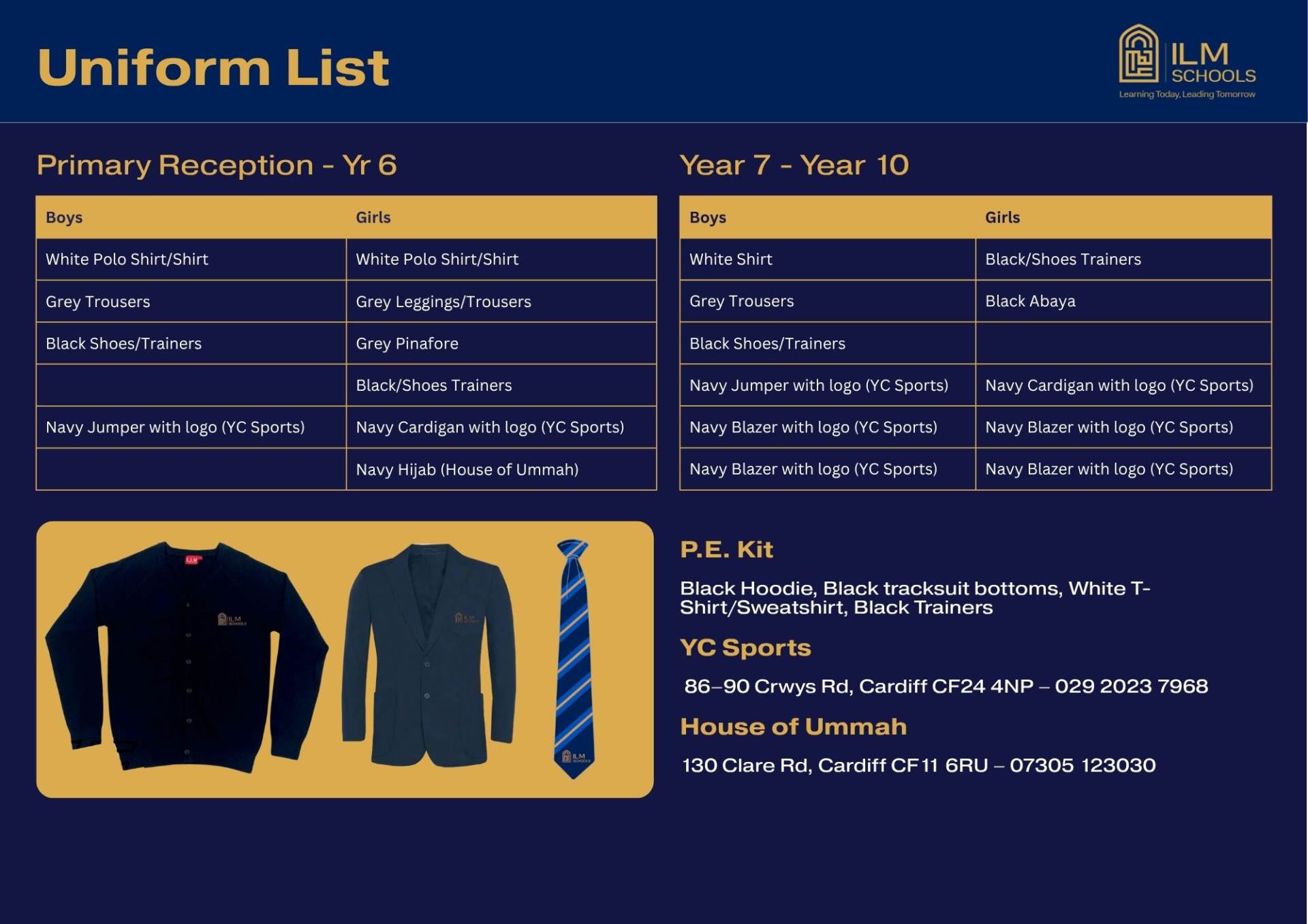 At ILM, a smart and consistent uniform is an essential part of our school culture. It promotes equality, strengthens our Islamic identity and helps pupils take pride in representing their school with dignity and respect.